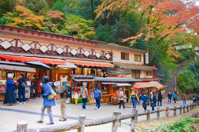大阪市中心部から車で約30分の場所に位置する『明治の森箕面国定公園・箕面大滝』。「日本の滝百選」にも選ばれている『箕面大滝』が見どころで、公園の入口から滝までつながる2.8kmほどの「滝道(たきみち)」は、自然の豊かさを体感できると人気のハイキングコースです。