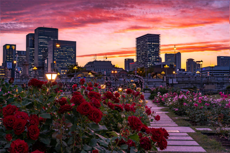 バラの見ごろは年2回、春は5月中旬から下旬、秋は10月中旬から下旬にかけて約30種・3700株のバラが園内を飾ります。「大阪市中央公会堂」や「大阪府立中之島図書館」といった、中之島のレトロビルと花園が調和する景色は唯一無二。