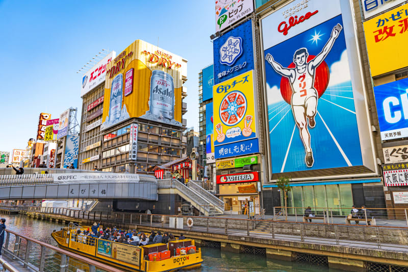 大阪らしいデートがしたい大人カップルは、ミナミの繁華街『道頓堀』は外せません。おなじみのグリコの看板、かに道楽の巨大かに看板、食いだおれ太郎の人形と思い出に残るフォトスポットも。食べ歩きにぴったりのお店も集結しているので、大阪デートがはじめてのおふたりにもおすすめです。