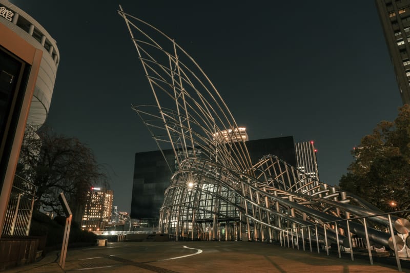 到着すると、アーティスティックな外観が目に飛び込んできますが、美術館は地上になく完全地下設計。竹の生命力と現代美術の発信をイメージしたモニュメントの中から、エスカレーターを下り、夜の美術館でゆっくりと芸術に浸る時間を…♪