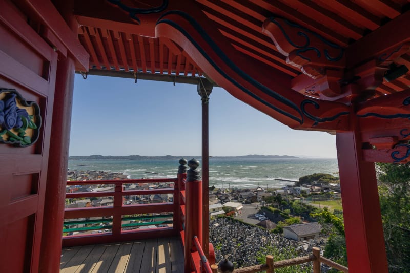 「観音堂」からは館山湾と伊豆大島を一望することができます。お天気のよい日に訪れて景色を眺めたら、心地よいひとときをすごせるはず。境内を巡りつつ、海の景色もぜひ楽しんでいきましょう。