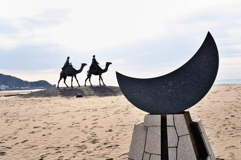 記念館のすぐそばに「月の沙漠」の歌に出てくる王子様とお姫様のモニュメントが並んでいます。夕暮れ時は、砂浜でラクダにまたがる王子様とお姫様の異国情緒あふれる撮影ができるはず。