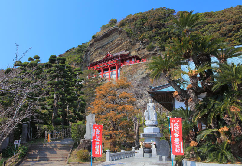 御本尊の「十一面観世音菩薩」は、地元漁民の海上安全を祈願して自然石に彫刻されたものといわれています。また見どころは、本尊を祀った「崖の観音」の名前で親しまれている「観音堂」。船形山の段壁に造られたお堂で朱塗りの柱がなんとも美しく鮮やかに映えています。