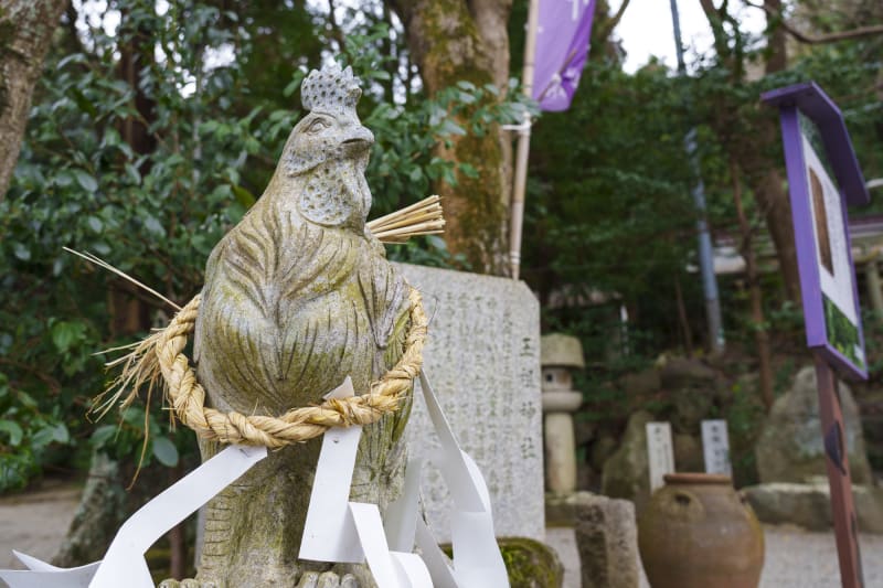 狛犬の前に、日本神話に伝わる長鳴鶏がお出迎え。長鳴鶏の鳴き声は長く伸び、天照大神に朝を知らせ世に光をもたらすきっかけを与えたといわれています。黒柏鶏の子孫が境内に生息しているので、鳴き声を聞けたらラッキーかも…!
