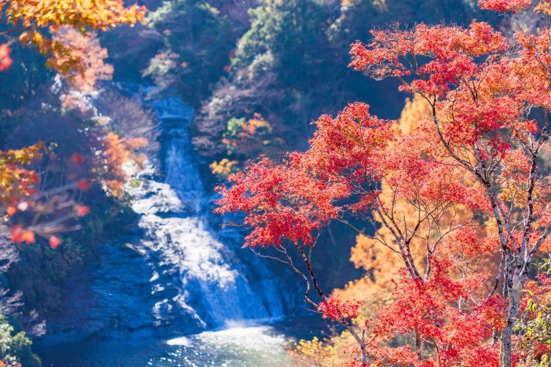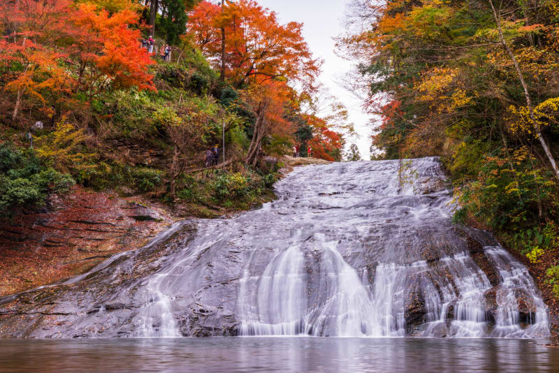 養老渓谷周辺で、さらなる絶景スポットを堪能したいなら『粟又の滝』へ。紅葉した木々のそばからに約100メートルに渡って滝が流れるようすが大迫力。雄大な景観とともにマイナスイオンが広がり、癒しやストレス解消などの効果も期待できそうですね。
