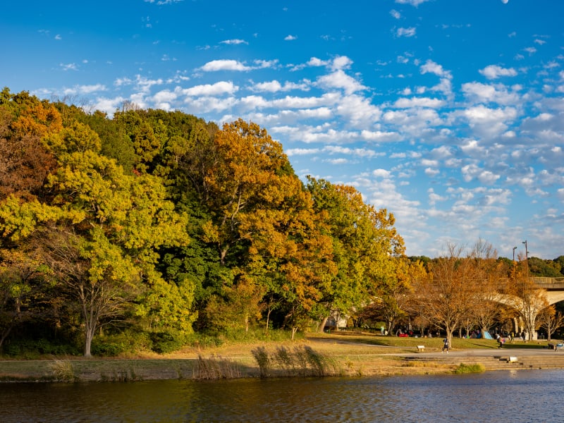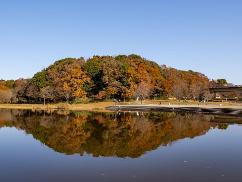 例年12月上旬には紅葉の見ごろを迎え、公園内の「つどいの広場」や「光と風の広場」、さらには東京ドーム約1個分の人工池「千駄堀池」の周辺に広がる豊かな樹木が赤や黄色に彩ります。