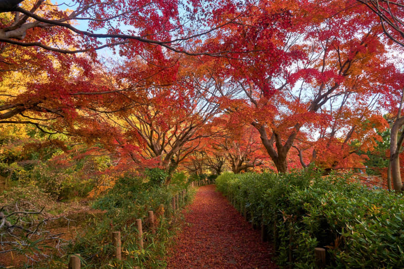 紅葉の見ごろには、鮮やかな樹木が道を上から囲む「もみじのトンネル」が必見。紅葉に包まれた道を歩いたら、夢のようなロマンチックな気分に浸れそうですね。