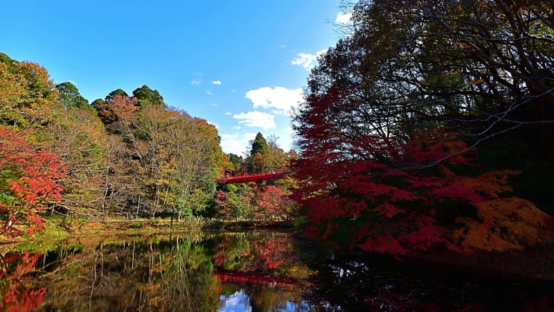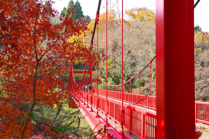 とくに、おすすめの絶景スポットは、園内の中心部に架かる支間64.4メートルの「いずみ橋」。ここから眺める新緑や紅葉の美しさはまた格別です。華やかな朱色に塗られた吊橋そのものも、インスタ映えすること間違いなし! 秋の情緒を感じられる写真撮影にも、ぜひトライしてみましょう。
