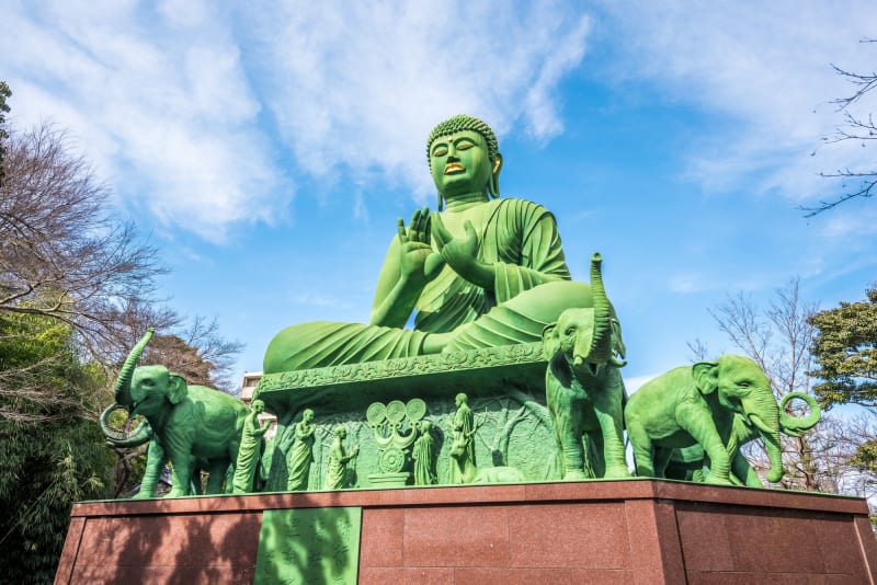 全長座高10mもの「名古屋大仏」は、鮮やかな緑の色で有名。目、唇、耳には、豪華な金箔が施されています。大仏を支えているのは台座でなく10頭の象、周りには鹿や僧の像も並び、仏教伝来の光景を思わせます。