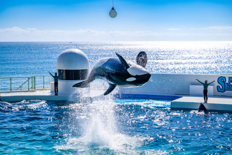 最大の目玉は、シャチやイルカたちのダイナミックなパフォーマンスが繰り広げられるショー。海をバックにした「オーシャンスタジアム」は、素晴らしい海岸線の絶景とともにパフォーマンスが楽しめるので、子どもも大人も必見。