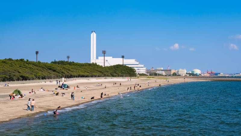 東京湾沿岸に位置する『稲毛海浜公園』は長さ約3km、面積約83haもの広さを誇る総合公園。白い砂浜が特徴のビーチは、2019年に都市型リゾートパークの「SUNSET BEACH PARK」としてオープンし、プールやグランピングなどの7つの施設が営業しています。