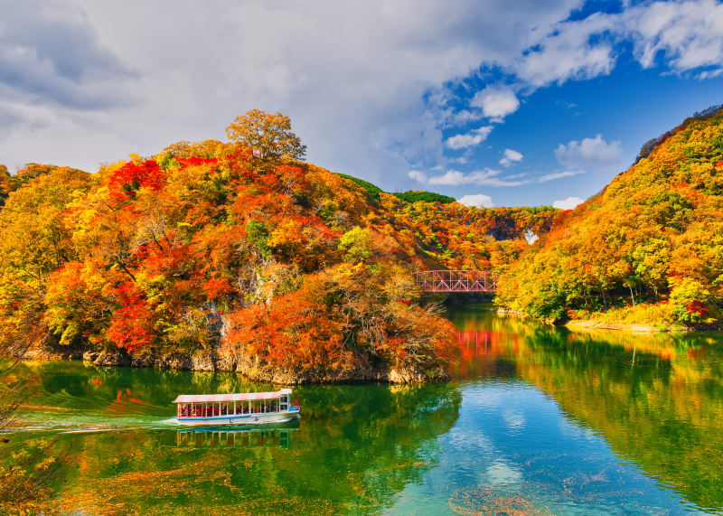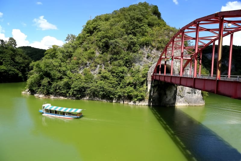 また、雄橋にも流れる帝釈川をせきとめて作られた人造湖「神龍湖(しんりゅうこ)」は、遊覧船での観光も可能。40分ほどの水上旅ではエメラルドグリーンの湖面とともに両岸の渓谷から新緑や紅葉と、美しく豊かな自然を感じられます。