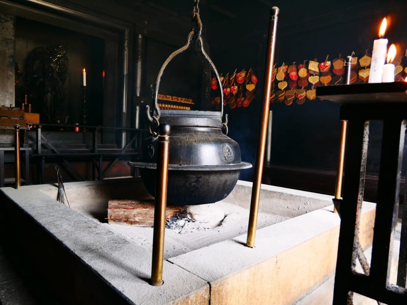 三鬼堂に近い「弥山本堂」の「霊火堂」には、1,200年以上燃え続ける「消えずの火」が設置されています。今も燃え続ける火に吊るされた大茶釜で霊水を沸かして飲むと、万病への効果や幸せが約束されるとの話も。