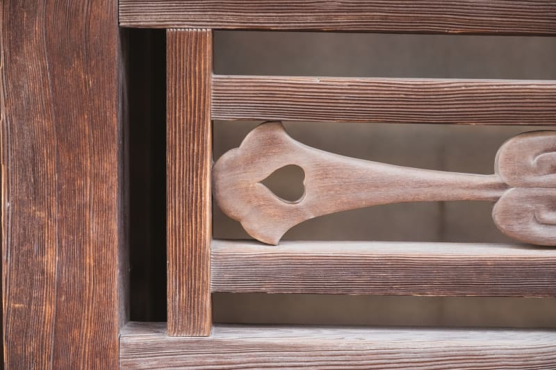 レトロな建物の「竹原格子」といわれるデザインをよく見ると、切り絵のような羽目板や紋様付きの横格子、ハートマークの形など家ごとに異なる模様があるのも魅力のひとつ。