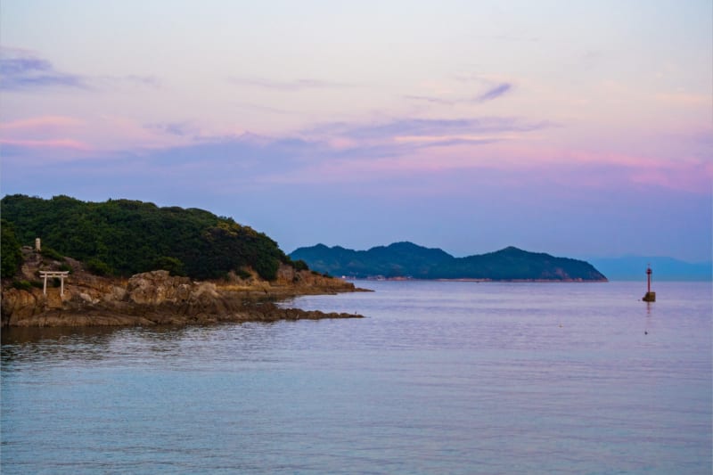 日が沈み始めると空がオレンジやピンクに染まり、海面に映るその光景はまるで絵画のよう。仙酔島の夕陽は、「日本の夕陽百景」にも選ばれています。とくに海岸沿いに青、赤、黄、白、黒と並ぶ「五色岩」とともに眺める夕陽は、自然の色合いが相まってとてもロマンチック。