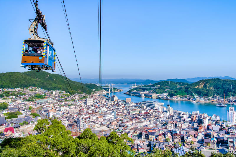長江口の山麓駅から千光寺山山頂をつなぐ「千光寺山ロープウェイ」。ロープウェイからは尾道市内を望む絶景が広がります。空中散歩は3分間であっという間に山頂駅に到着。