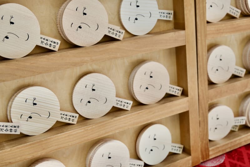 美麗の神を祀っている『河合神社』では手鏡を模した鏡絵馬を使った美人祈願が若い女性に大人気! 手鏡の形をした絵馬に描かれた顔は、自分の顔に見立ててメイクアップ。裏面に願い事を書いて奉納することで、外見だけでなく内面も磨かれ美しくなるといわれています。