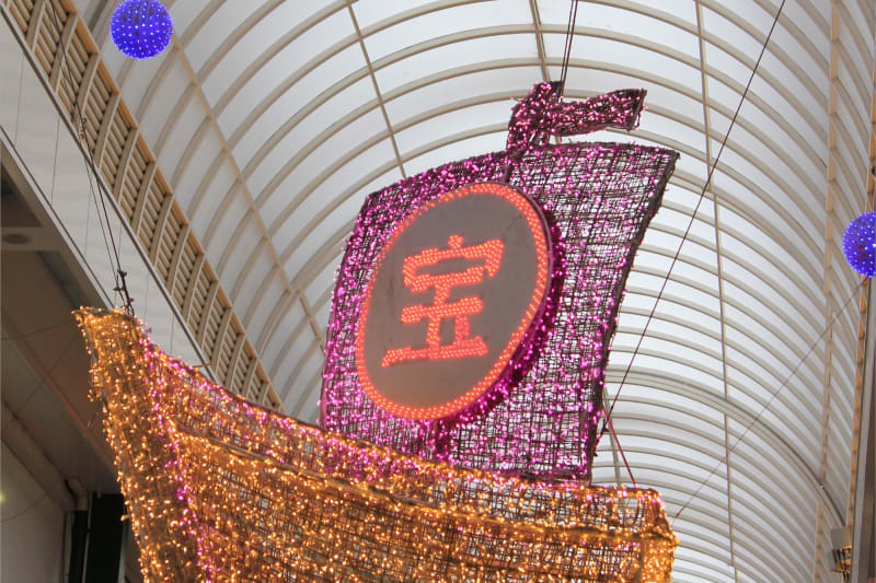 なんば駅周辺には何とも大阪らしいユニークなイルミネーションもあります。駅前からつながる戎橋筋商店街の「縁起物イルミネーション」は十日えびすの参道になぞらえて、打出の小槌や招き猫、宝船といった縁起物のモチーフが商店街の宙を舞うように飾られていますよ。