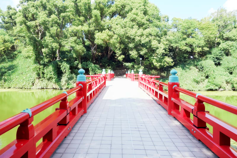 古墳への行き方は、園内北側にある川にかかる朱色の橋を渡って向かいます。茶臼山は標高26mのなだらかな山なので、プチハイキングにもぴったり。冬は地面が乾燥し、足元も見やすいうえ歩きやすいので、見学にはベストシーズンかも!