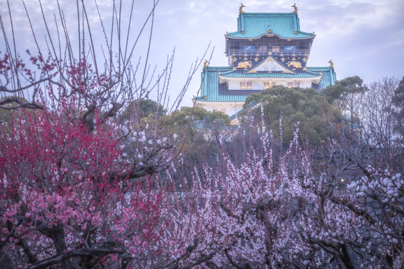そして冬の風物詩といえば、大阪城公園の見事な梅。100品種・1,200本を越える梅の木が植えられていて、1月から3月頃にかけて順に開花していきます。その時期の開花に合わせ変化する様子をゆっくりと鑑賞できるのが魅力です。周辺には期間限定コンビニもオープンし、梅にまつわるホットメニューの販売も行われます♪