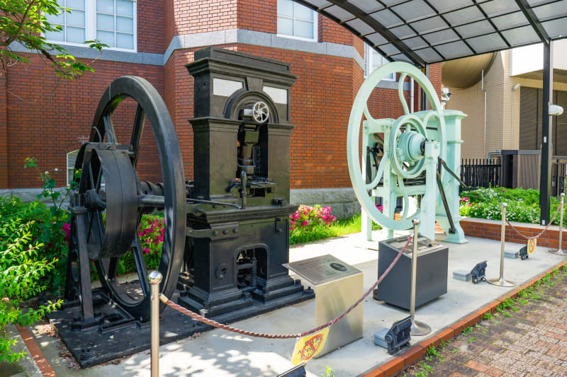 そのほか、屋外にはフランス・ドイツ製の圧印機の展示があったり、正門横には金属工芸品や記念貨幣のセットアイテムを販売するミントショップがあったりと、見どころがたくさん。日本硬貨の図柄が施された大きなお煎餅は、大阪土産にぴったりですよ。