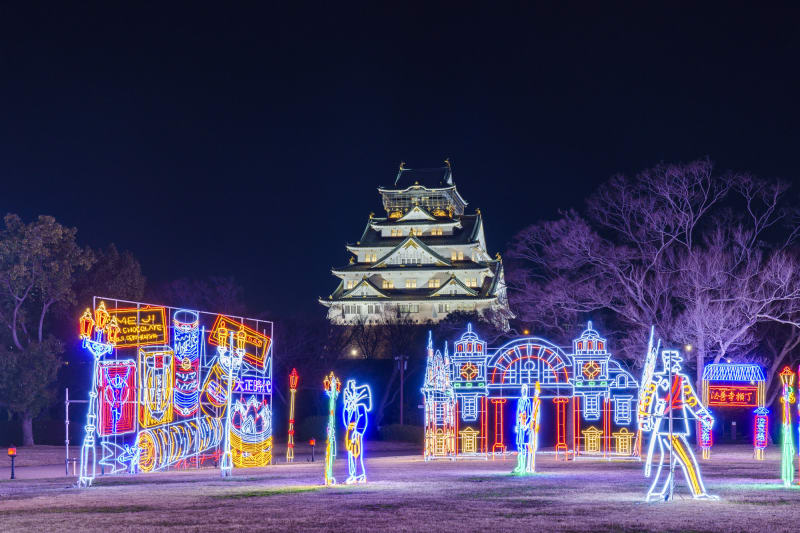 冬季の17時からはイルミネーションイベントの『大阪城イルミナージュ』が開催。格式高い大阪城とコラボレーションするLEDやネオンの光は、大阪での冬旅をあたたかく素敵に締めくくってくれますよ。