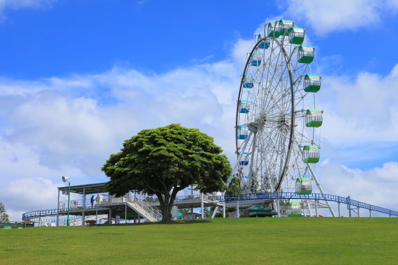 一面に広がる芝生が特徴的な「カントリーエリア」、四季の花を観賞できる「レイクエリア」では、釣り堀やシャボン玉が出てくるおもしろ自転車なども楽しめますよ。人気アトラクションが多い「パークエリア」は、さまざまな動物と触れ合えるこども動物園と、みかん狩りなどの収穫体験も実施。
