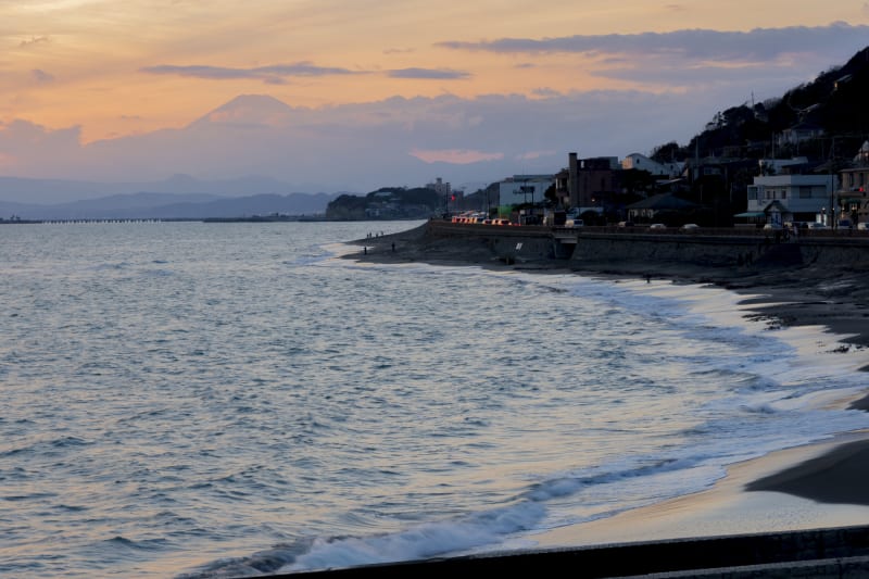 日帰り旅行の締めくくりは、海岸沿いに戻り『稲村ヶ崎』でうっとりとするような夕景を眺めましょう。天気が良いと、富士山のシルエットが夕焼けに浮かび上がる絶景で有名。日が沈む少し前に立ち寄り、空の色が移り変わるマジックアワーの光景を眺めるのもおすすめです。