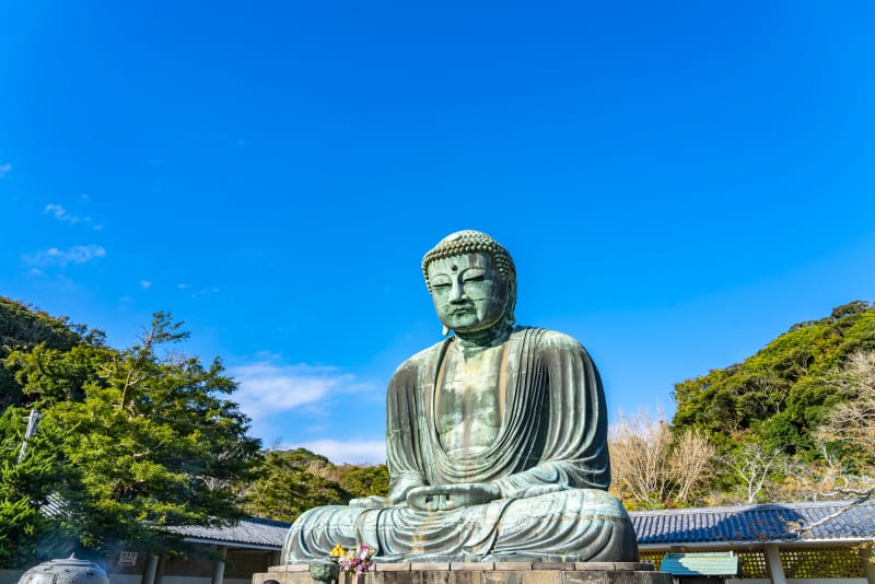 造立の開始は建長4年(1252)にまで遡るといわれていわれる鎌倉大仏の正式名称は「国宝銅造阿弥陀如来坐像」。像高約11.3m、重量約121tのスケールを誇り、目の前に立つとその大きさに圧倒されるはず