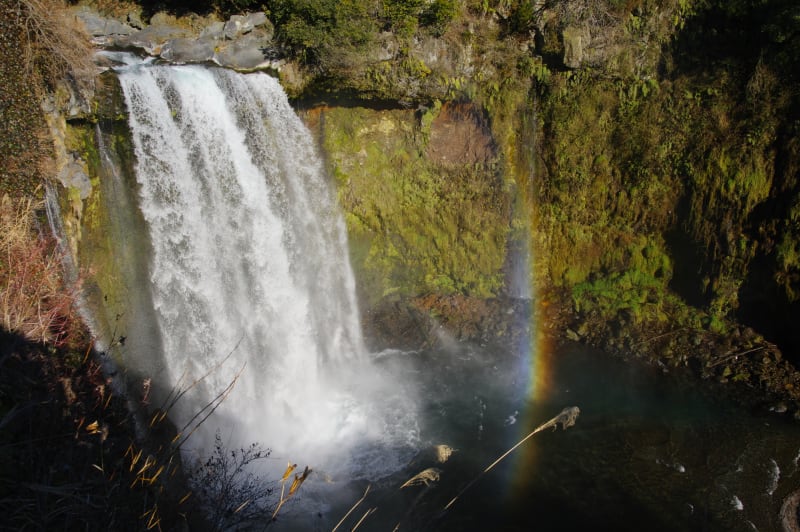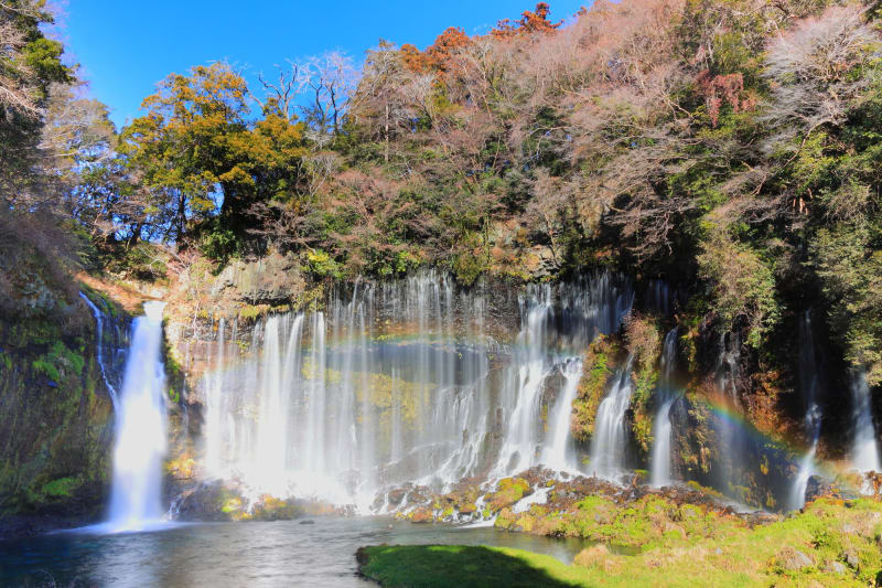 高さ約20m幅約150mの迫力ある滝は、名前の通り白い絹糸が流れ落ちるような繊細な滝の流れが魅力。富士山の雪解け水が流れる滝は、優しい雰囲気で心癒やされるはず!