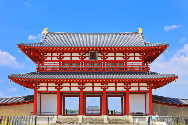 奈良県の歴史と文化を楽しく学びたいなら、平城宮の跡地に整備された『平城宮跡歴史公園』がイチオシスポット。東西南北約1kmにわたる広大な敷地は、「朱雀門」や「第一次大極殿院」などの復元作業が行われ、奈良時代の美しさを保っています。