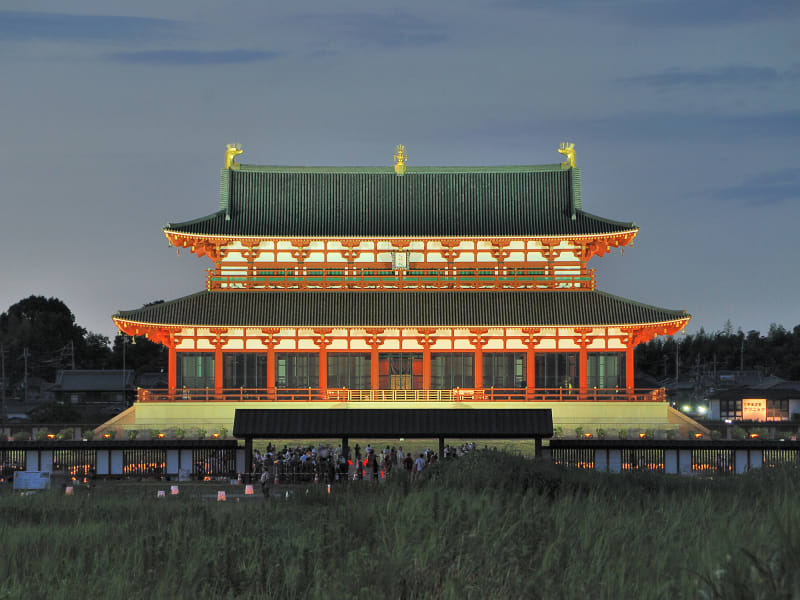 朱雀門のさらに奥にあるのが、平城宮最大の宮殿・第一次大極殿院です。かつて天皇の即位式なども行われた格式高い建物は、44本の朱色の柱と約9万7,000の屋根瓦から成り立っています。荘厳さが感じられる宮殿を、ぜひ写真におさめて帰りましょう。
