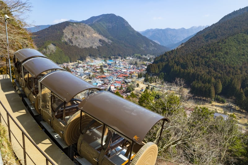 面不動鍾乳洞の見どころひとつとなっているのが、森の中を走り抜けるモノレールです。「どろっこ」と呼ばれる愛称どおり、丸太デザインの愛らしい車両が特徴的。開放感あふれる車中からは、自然豊かな洞川の街並みを見降ろせますよ。