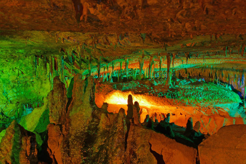 「どろっこ」を降りたら、面不動鍾乳洞の入口がすぐそこに。洞内では色とりどりにライトアップされた鍾乳石や石筍、石柱が織り成す美しい景色が順路に沿って展開されています。1センチのびるのに100年以上必要といわれている鍾乳石で埋めつくされた天井は必見!