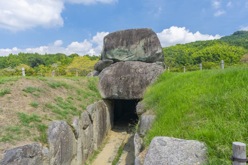 蘇我馬子のお墓とも伝えられている石室の総重量は約2,300トン。30数個の巨石を積み上げた両袖式の横穴式で、岩の隙間から中に入れるようになっているので、ひんやりとした空気に身をゆだねてみて。
