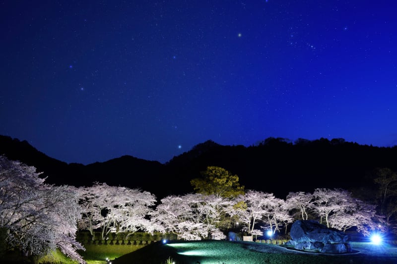 石舞台古墳の周りには30本ほどの桜が植えられていて、開花シーズンに合わせてライトアップも実施。儚ない夜桜との対比で、巨岩の存在感が増します。