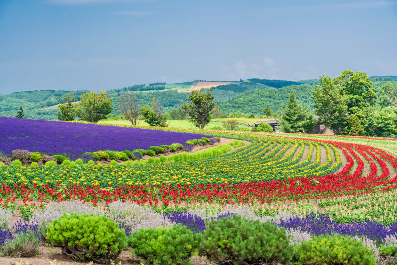 北海道美瑛駅から車で10分の『ぜるぶの丘 ZELB HILL』。丘陵地には、カラフルな絨毯のような花畑が広がります。5月ごろから花植えがおこなわれ、夏にはラベンダーやひまわり、秋にはコキアなど約30種類の花々が咲き誇るスポット。見ごろは7月上旬頃なので、北海道の夏を満喫してみて。