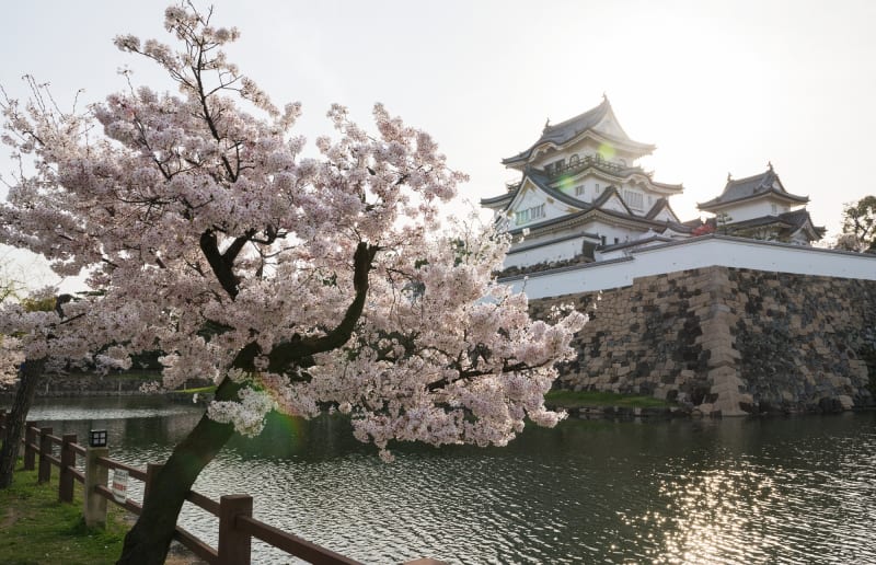 岸和田城の桜の見ごろには、約170本の桜が咲き誇ります。真っ白な天守閣を囲む桜の景色は圧巻。桜が散る頃に見られる、城を囲む堀の水に花びらが流れる花筏(はないかだ)もこの時期ならではの景色です。