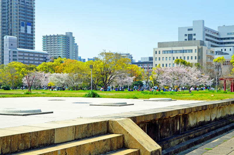 園内からは大阪城天守閣が眺められ、春になると桜に囲まれた姿を鑑賞できます。広々とした園内の桜も満開に。桜の名所・大阪城の近くにありながらも穴場スポットなので、ゆっくりと桜を鑑賞したい方にぴったりですよ。