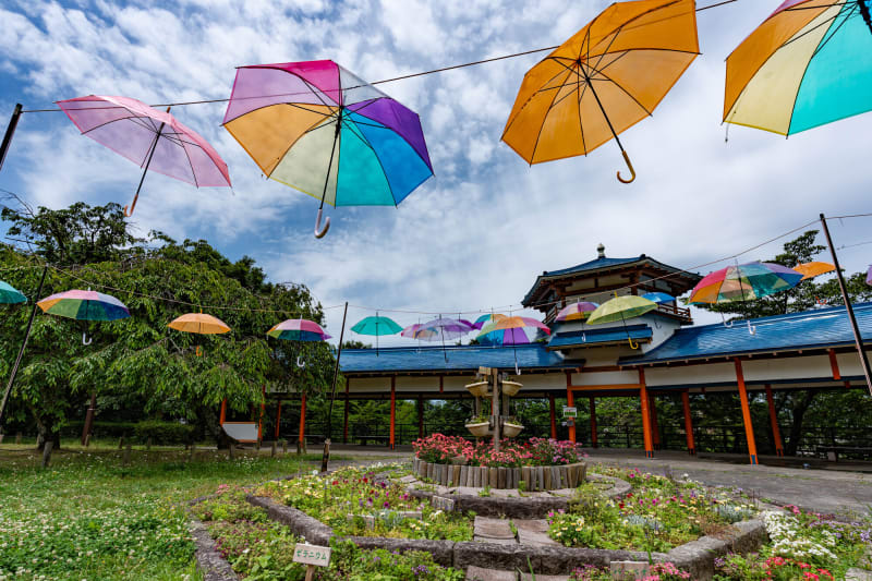 例年、3月下旬から4月上旬に行われる「長野公園さくらと光の回廊」では、桜だけではなく竹トンネルや和傘オブジェ、竹灯篭による特別ライトアップと、風情豊かな景色も魅力。桜が見ごろを終え、梅雨にはいるとカラフルなアンブレラスカイのイベントも行われます。