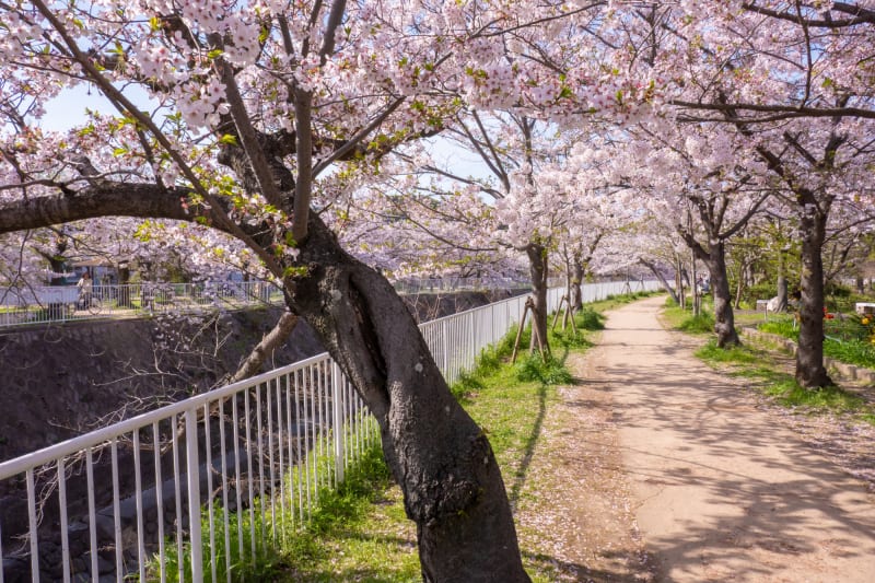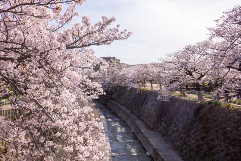 桜を見ながらのんびりお散歩したい方は、神戸市内にある『妙法寺川公園』がぴったり。妙法寺川沿いにある四季折々の風景を楽しめる公園で、春になると川沿いにずらりと約400本の桜並木が出現します。川のせせらぎを聞きながら、お散歩やジョギングができますよ。