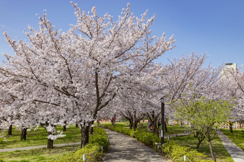 西郷川河口公園から1.5kmほど歩いたところには、もう一つの桜の名所『灘浜緑地』があります。約200本のソメイヨシノが植えられているので、景色の違いを楽しむのもおすすめ。海の近くにあるので、潮風を感じながらの夜桜鑑賞も気持ちいいはず♪
