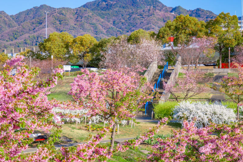 電車で神戸のお花見を計画しているなら、阪神・西灘駅から徒歩約8分の『西郷川河口公園』が狙い目。その名のとおり、西郷川の河口に広がる1ヘクタールの緑地公園です。早春の桜が咲く名所は2月上旬ごろには、西郷川河口公園に春の訪れを告げる河津桜がピンク色の花を咲かせます。