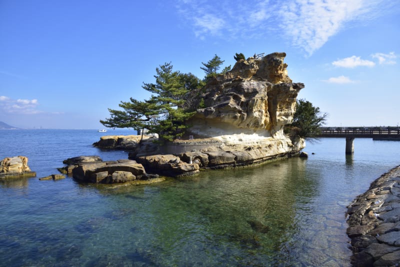 また、岩樟神社のある岩谷港近くには、日本最古の国土の候補地という説もある「絵島」があります。砂岩が波の影響を受けて、個性的な形に変化した姿が特徴的。夜のライトアップは「海に浮かぶ光の舞台」とも呼ばれるほど美しいので、セットで巡ってみましょう。