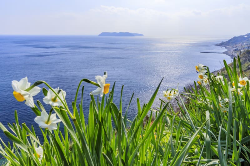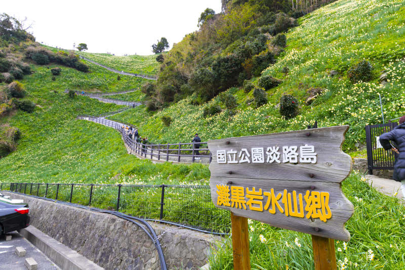 瀬戸内海の青い海をバックにした、約500万本もの二ホンスイセンが斜面に咲き誇るスポットです。メインの見どころとされる展望台にのぼると、スイセンだけでなく、目の前に広がる太平洋と国生み神話の舞台とされる沼島も眺められます。
