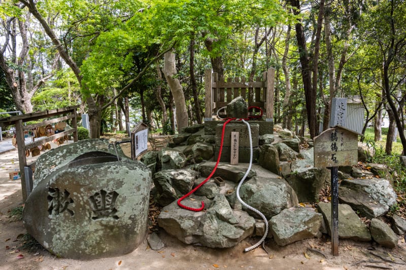境内のお参り順路は、拝殿から御神木へ、八百萬神社に参拝し鶺鴒石に立ち寄るのが推奨されています。八百萬神社は、夫婦神の御子をお祀りする末社なので、ぜひ手を合わせていきましょう。赤と白の縄が付いた鶺鴒石は、片手に縄、もう片手でお互いの手を取り合ってお祈りするのがカップル流の作法です。