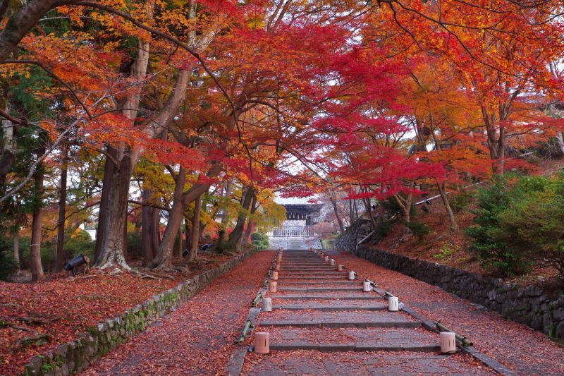 毘沙門堂門跡は紅葉の絶景スポットとしても有名。とくに、見ごろが終わる例年12月の時期が絶好のタイミングです。紅葉の葉が落ちると「敷き紅葉」が参道の勅使坂周辺で見られ、まるで赤い絨毯のように一面へ美しく広がります。