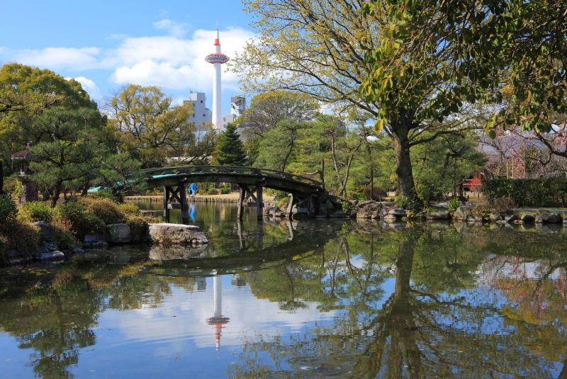 京都駅から徒歩10分ほどであるにもかかわらず、春には桜やツツジ、秋には紅葉やイチョウなど豊かな自然を感じられるのも魅力のひとつ。秋にはライトアップが行われ、幻想的な景色が見られますよ♪