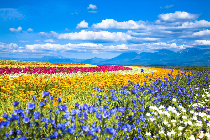 上富良野町にある『フラワーランドかみふらの』は、10万平方メートルの敷地に咲くカラフルな花畑が人気。