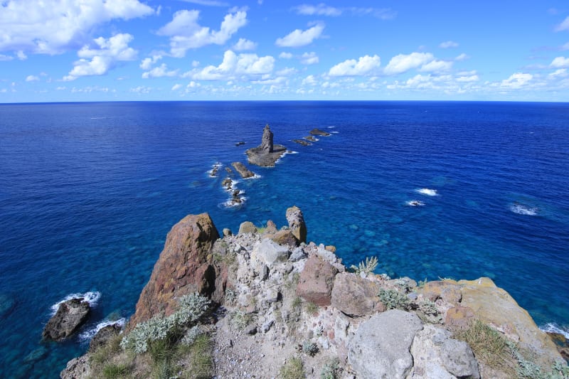 『神威岬』の先端へ行くには、「チャレンカの小道」と名付けられた遊歩道を20分ほど歩きます。岬の先端からはシャコタンブルーと呼ばれる青い海と、沖にそびえたつ大きな岩「神威岩」が目の前に現れます。